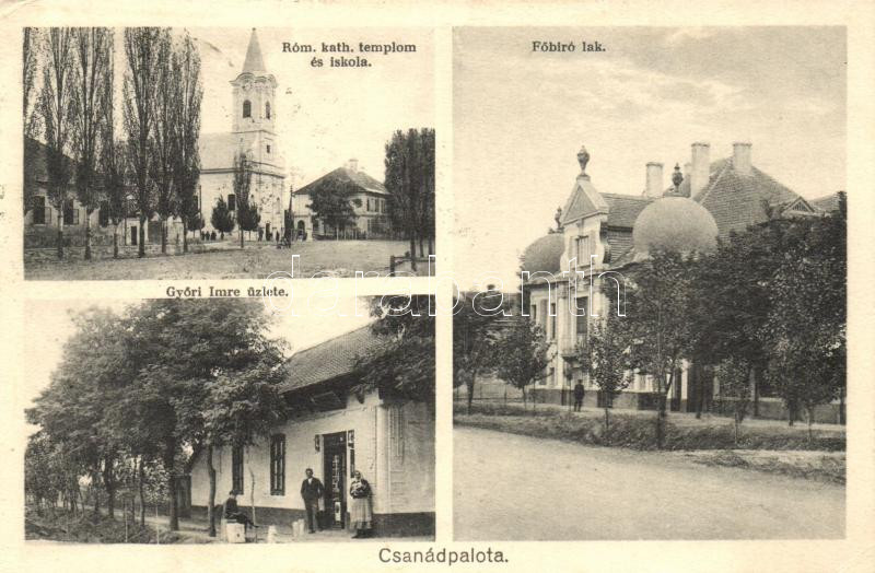 Csanádpalota, Római katolikus templom és iskola, Főbírói lak, Győri Imre üzlete (EK)