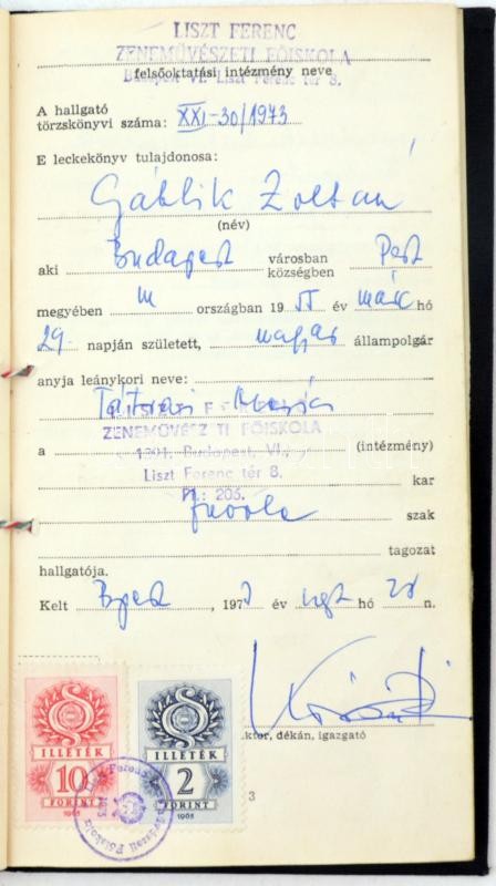 1973 Simon Albert (1926-2000) karmester és más oktatók aláírásai zeneművészeti főiskolai leckekönyvben