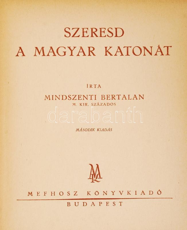 MINDSZENTI Bertalan: Szeresd a magyar katonát. 2. kiadás. Bp. [é.n.] M... https://www.darabanth.com/en/225-Online-auction/225.0/Other-collectibles/Books-Military~8/MINDSZENTI-Bertalan-Szeresd-a-magyar-katonat-2-kiadas-Bp-en-Mefhosz-Szamos-egesz-olda~II972346