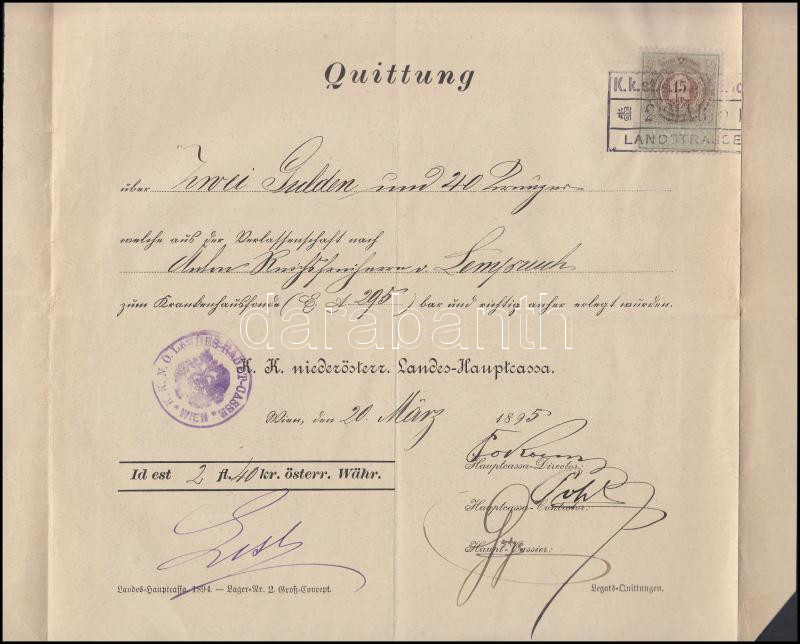 Description: 1895 Német nyelvű nyugta Anton Reichsfreiherr von Lempruch őrnagy, a porosz-osztrák-olasz háború veteránja részére kiállítva 2 forint 40 krajcárról, okmánybélyeggel /