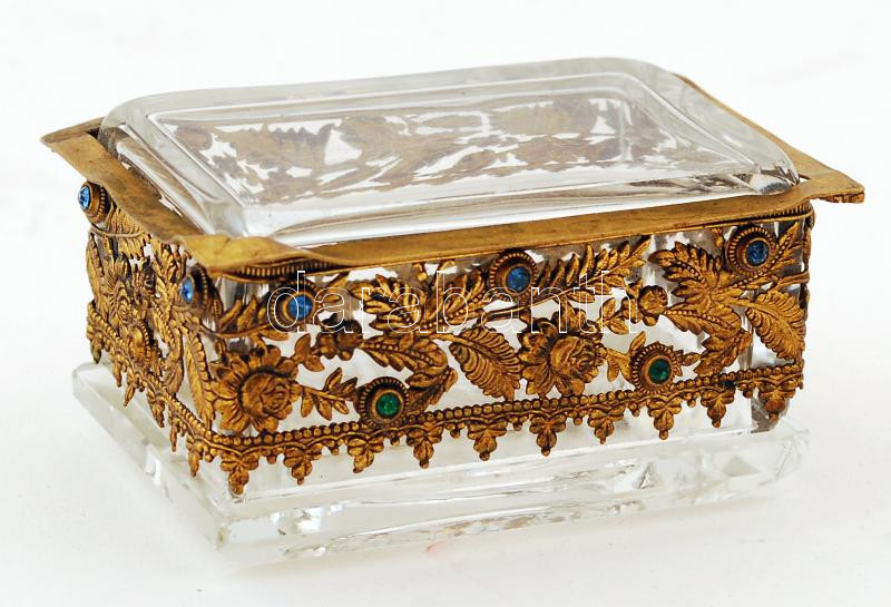 1920-1940 Posseidon és puttóval díszített üveg ékszeres dobozka, ornamentális, kövekkel kirakott, réz oldalsó rész. Fedő sarkai sérültek, 3 db kő hiányzik. 5x9x5,5cm