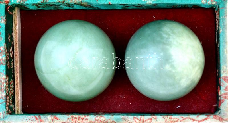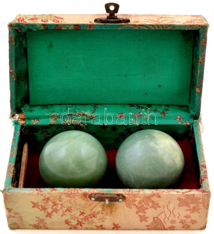 2 db zöld kőgolyó saját, szövetborítású, bársony bélésű keleti motívumos fa dobozban