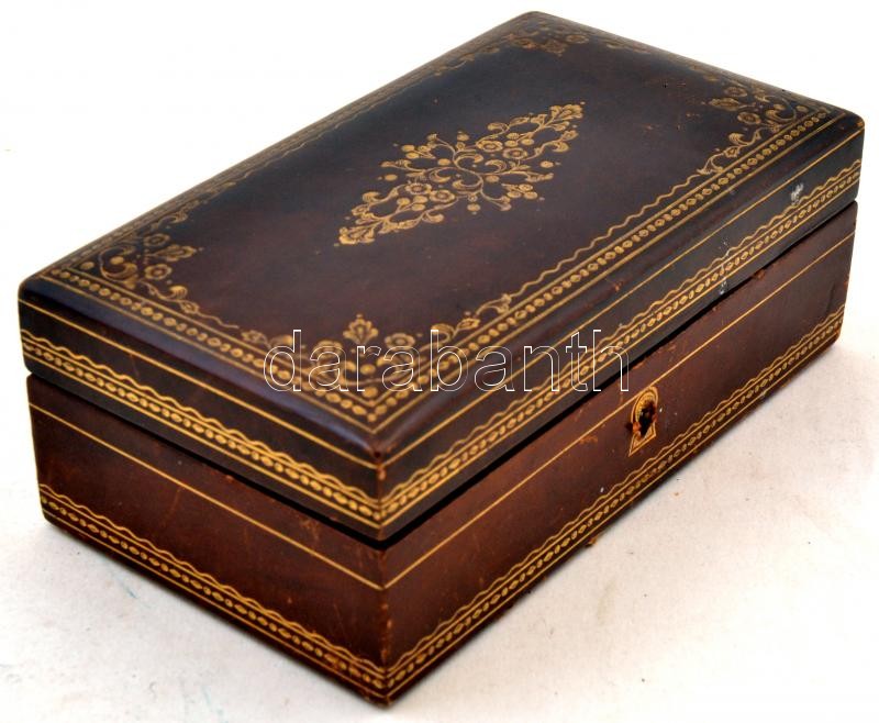 Régi, aranyozott, bőr borítású fadoboz, a hozzá tartozó kulccsal, 18×1...