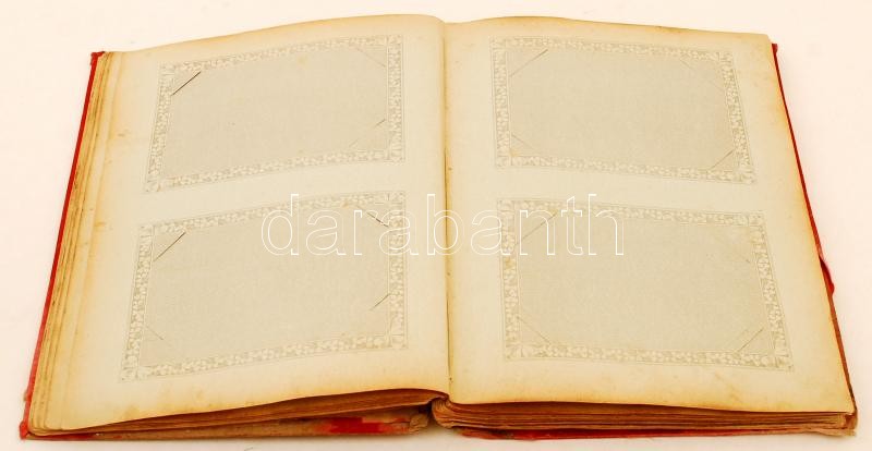 Üdvözletek a nagy világból. Üres fotóalbum, díszes, de megviselt vászonkötésben, szakadt gerinccel.
