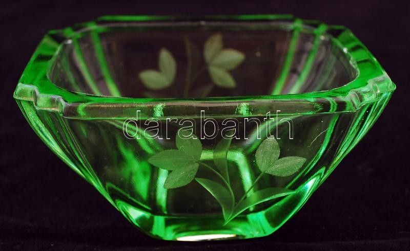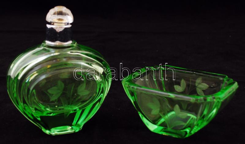 Zöld gravírozott parfümös üveg és tálka, a tálkán csorbákkal, m: 11 cm, 10x8x4,5 cm