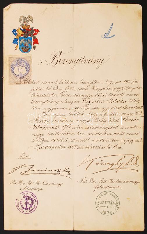 1898 Budapest, alispán által kiállított családi nemesség- és címerigaz... https://www.darabanth.com/en/225-Online-auction/225.0/Other-collectibles/Historical-documents-manuscripts~38/1898-Budapest-alispan-altal-kiallitott-csaladi-nemesseg-es-cimerigazolas-Pest-varmegyeb~II987762