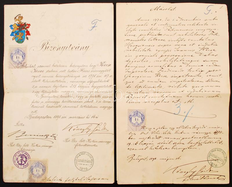 1898 Budapest, főlevéltárnok által kiállított családi nemesség- és cím... https://www.darabanth.com/en/225-Online-auction/225.0/Other-collectibles/Historical-documents-manuscripts~38/1898-Budapest-foleveltarnok-altal-kiallitott-csaladi-nemesseg-es-cimerigazolas-Pest-va~II987926