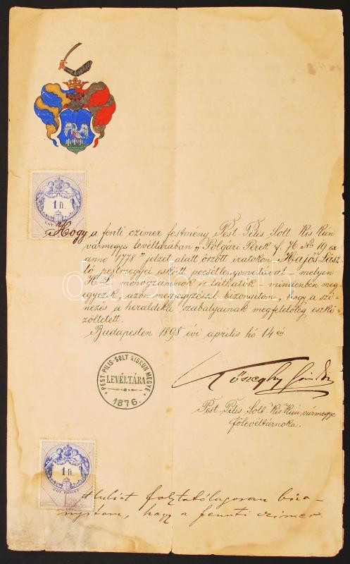 1898 Budapest, főlevéltárnok által kiállított családi nemesség- és cím... https://www.darabanth.com/en/225-Online-auction/225.0/Other-collectibles/Historical-documents-manuscripts~38/1898-Budapest-foleveltarnok-altal-kiallitott-csaladi-nemesseg-es-cimerigazolas-Pest-va~II987929