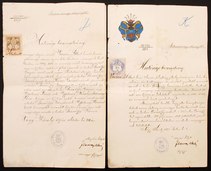 1898 Nagykároly, 2 db alispáni helyettes által kiállított családi neme... https://www.darabanth.com/en/225-Online-auction/225.0/Other-collectibles/Historical-documents-manuscripts~38/1898-Nagykaroly-2-db-alispani-helyettes-altal-kiallitott-csaladi-nemesseg-es-cimerigazolC3~II987889