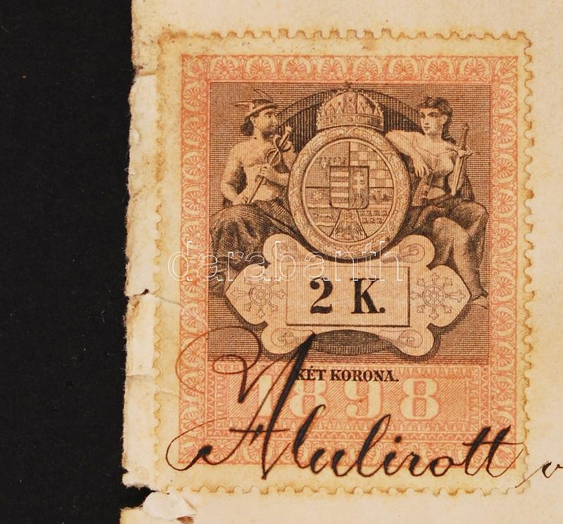 Description: 1898 Nagykároly, 2 db alispáni helyettes által kiállított családi nemesség- és címerigazolás Szatmár vármegyéből, okmánybélyeggel, az egyik igazolás elején megfestett címerképpel