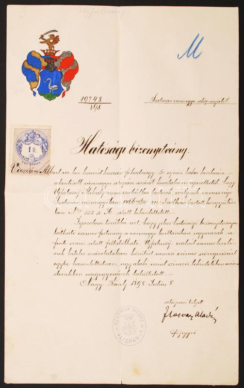 1898 Nagykároly, alispáni helyettes által kiállított családi nemesség-... https://www.darabanth.com/en/225-Online-auction/225.0/Other-collectibles/Historical-documents-manuscripts~38/1898-Nagykaroly-alispani-helyettes-altal-kiallitott-csaladi-nemesseg-es-cimerigazolas-Sz~II987752
