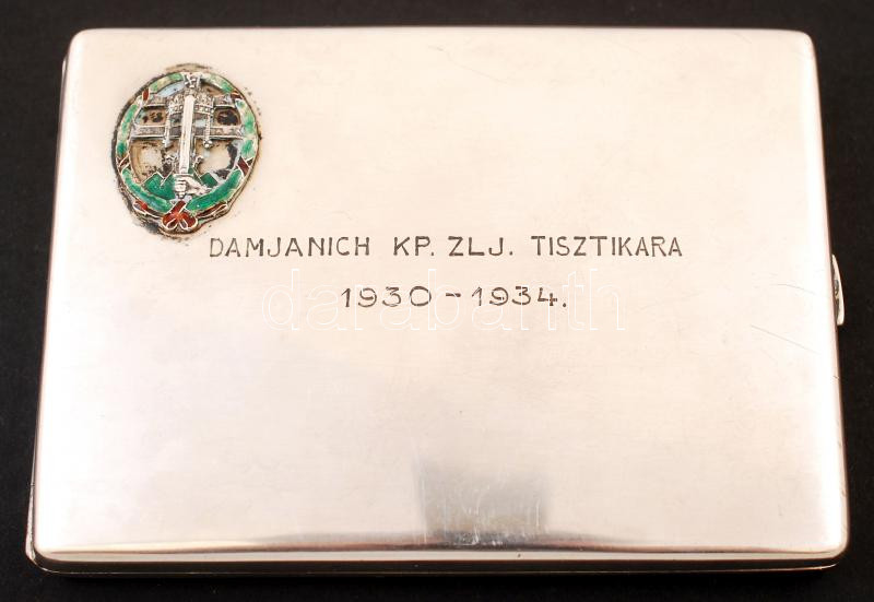 Ezüst cigarettatárca, jelzett, "Damjanich KP. ZLJ. Tisztikara 1930-1934" felirattal, tűzzománc díszítéssel. br.: 190gr, 8,8x11,5x0,8cm