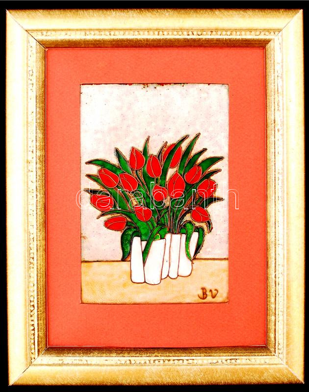 BV jelzéssel: Vörös tulipán. Tűzzománc, fém, jelzett, keretben, 9x14 c...