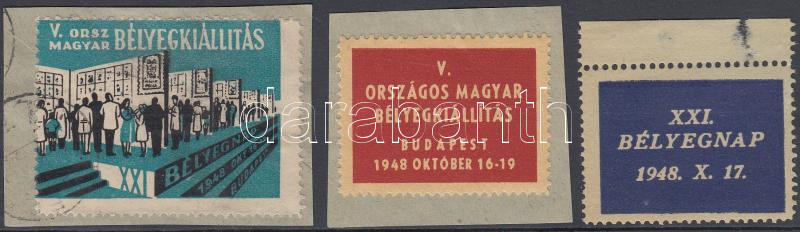 1948 Magyar Országos bélyegkiállítás 2 db levélzáró kivágáson + XXI. Bélyegnapi levélzáró