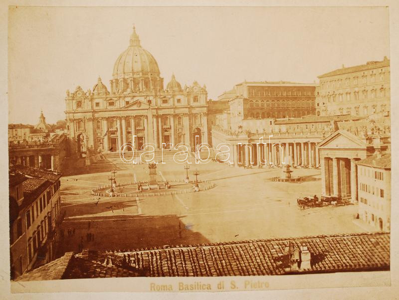 Róma legfontosabb műemlékei régi képeken albumba ragasztva: Basilica, Panteon, Fontana di Trevi, Campidoglio, Arco di Settimo, Foro Romano, Tempio di Antonio, Arco di Tito e di Costantino, Piazza del popolo, basilica di S. Maria Maggiore, Piramide di Caio Cestio. Az album fedőlapja hiányzik. 11x16,5cm/ Old Roma photos