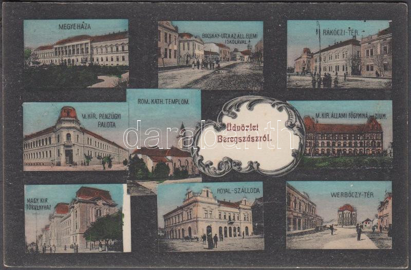 Beregszász, Megyeháza, Pénzügyi palota, Törvényház, Bocskay utca, Rákóczi és Werbőczy tér 'Haladás' kiadása / county hall, financial palace, court, street, squares (EK)