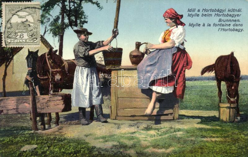 Hortobágy, Idill a kútnál, folklór, Divald és Monostory, No. 7. (Rb)