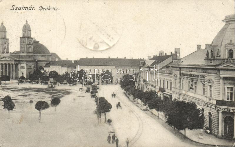Szatmárnémeti, Deák tér, Római katolikus templom Első Magyar Általános Biztosító Társaság, Szatmár Gőzmalom Társulat, Hazai Iparcsarnok, Paskuj Imre boltja / square, Roman catholic church, insurance company, steam mill company, industrial company, shop (EK)
