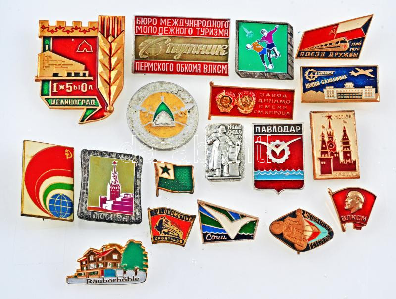 18db külföldi jelvény és kitűző, főleg szovjet darabok, közte DN "Poltava 1709" zománcozott fém jelvény, DN "Pavlodar" zománcozott fém jelvény T:vegyes