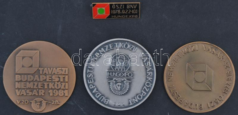 1977-1981. "HUNGEXPO - Budapesti Nemzetközi Vásár" 3db klf fém és Br emlékérem tokban és anélkül + jelvény T:2