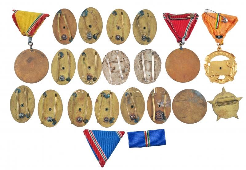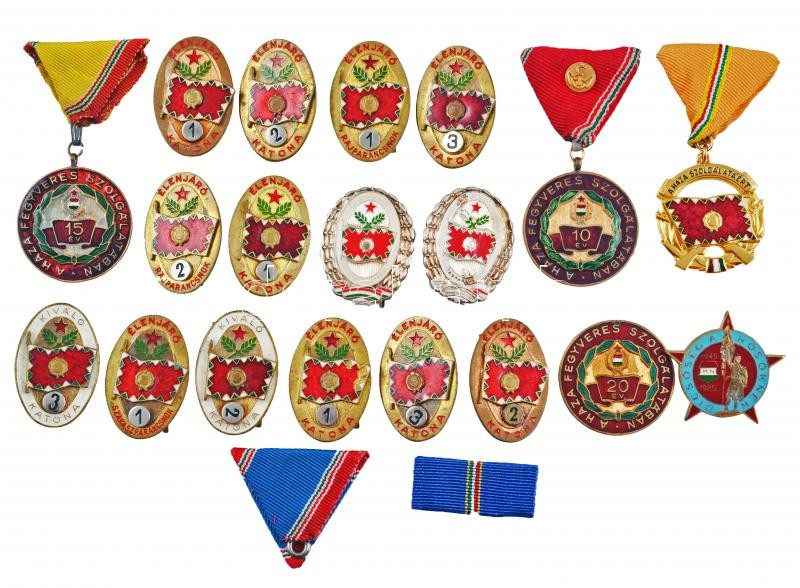 21db vegyes szocialista kitüntetés, jelvény, szalag, közte több "Élenjáró Katona", "Kiváló Katona" jelvény, "A Haza Fegyveres Szolgálatában" 10, 15 és 20 év után, "Dicsőség a hősöknek 1945-1985" fém jelvény, kettő kitüntetés tokban T:vegyes