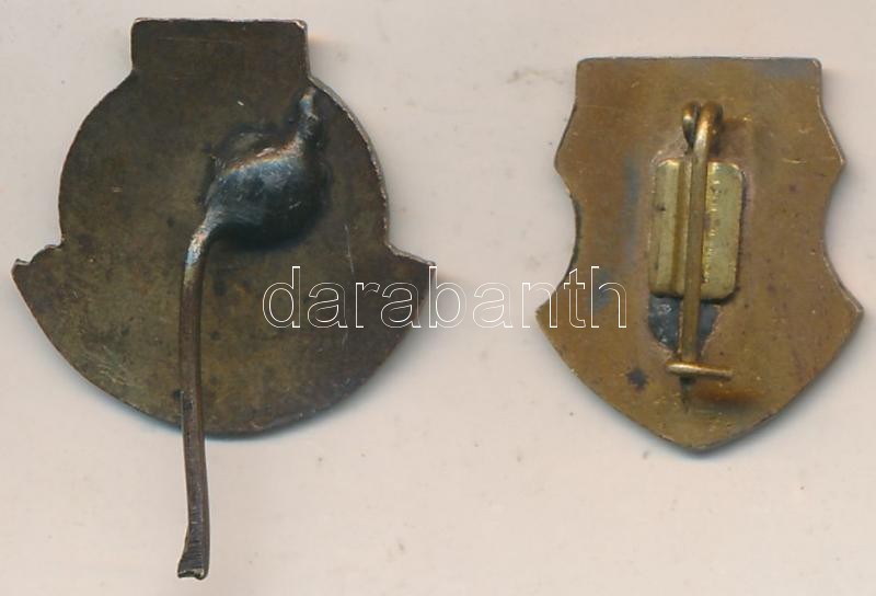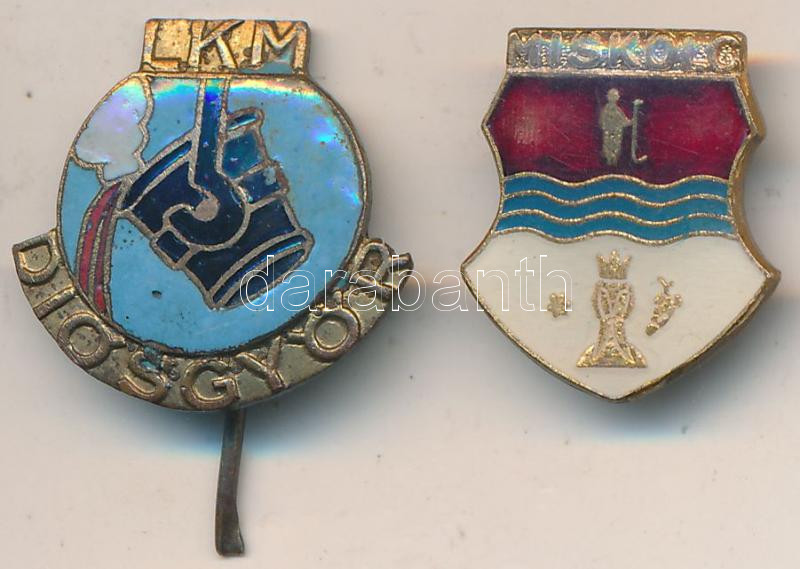 ~1970. "LKM (Lenin Kohászati Művek) Diósgyőr" zománcozott fém kitűző, hiányos tűvel + "Miskolc" zománcozott fém jelvény T:2,2-