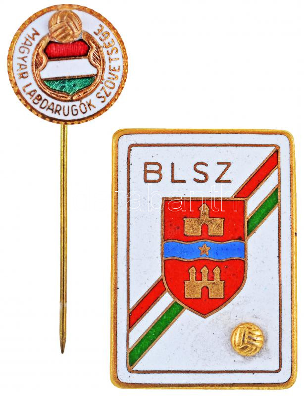 ~1970. "Magyar Labdarúgók Szövetsége" aranyozott, zománcozott tombak jelvény + "BLSZ (Budapesti Labdarúgó-szövetség)" aranyozott, zománcozott jelvény tű nélkül T:2