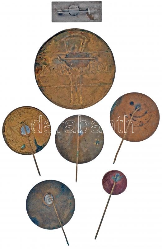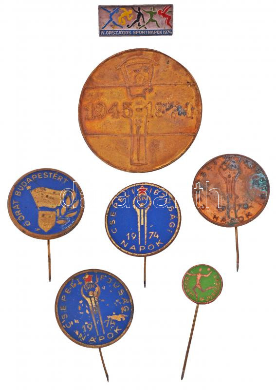Description: 7db ifjúsági sport jelvény és kitűző, közte 1957. "6 órát Budapestért - 1919-1957 KISZ" festett fém kitűző + 1974. "IV. Országos Sportnapok" fém jelvény, "Csepeli Ifjúsági Napok 1974" festett fém kitűző T:vegyes