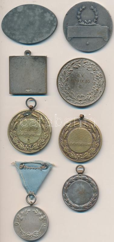 8db klf sportérem, közte 1939. "Pénzintézeti Központ Tisztviselőinek Sportegyesülete 1923 / G. V. 1939. IX. 30. II. hely" ezüstözött Br díjérem (40mm), 1943. "Országos Leventeverseny 1943 II. hely" fém díjérem füllel (36mm) T:vegyes