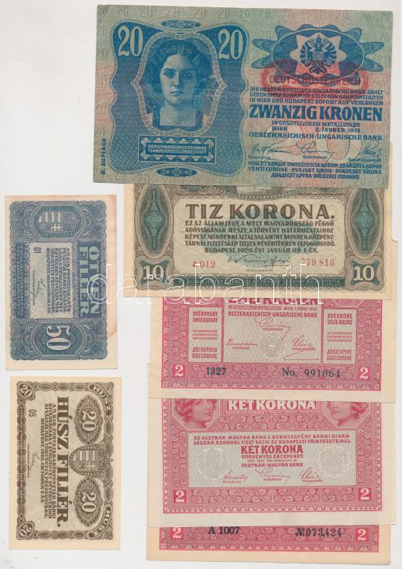 1913. 20K piros "Deutschösterreich" felülbélyegzéssel + 1917. 2K (3x) egyik zöld "Deutschösterrich" felülbélyegzéssel + 1920. 20f + 1920. 50f + 1920. 10K T:I-III