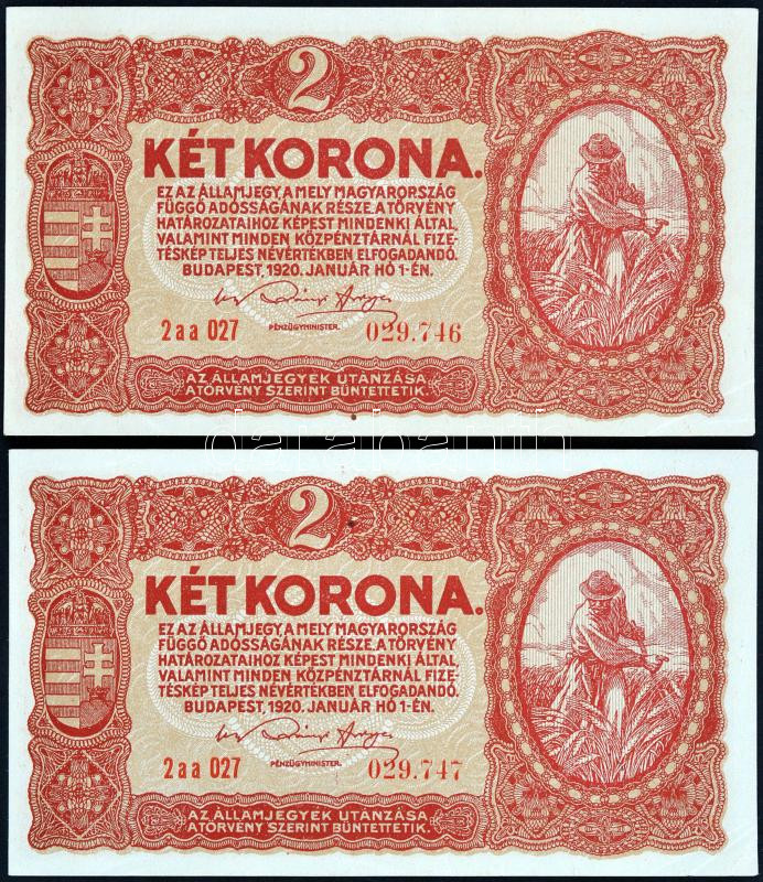 https://www.darabanth.com/en/227-Online-auction/227.0/Numismatics/Hungarian-Banknotes~600008/1920-2K-2aa-2x-egymas-utani-sorszammal-T-I~II1010345