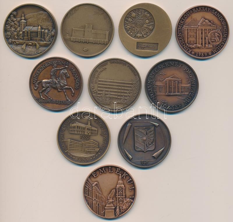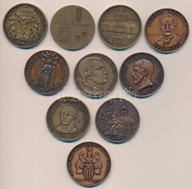 Description: 10db-os vegyes magyar Br emlékérem tétel, közte "Szabó Kálmán", "Bessenyei György", "Gyulai Várszínház", "Kunszentmiklós Baksay Sándor Gimnázium" stb. T:1,1-,2