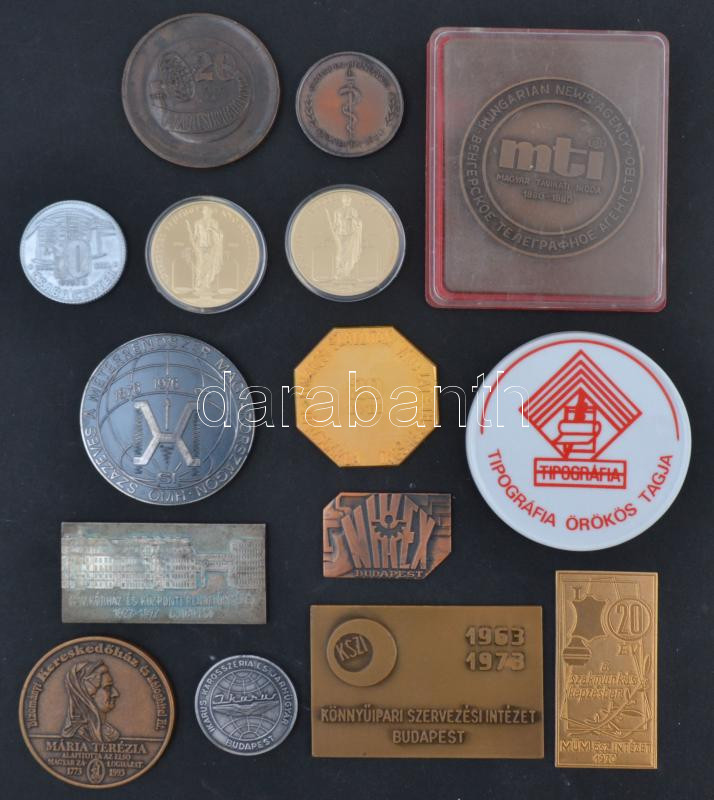 15db magyar vállalatok jubileumai alkalmából készült plakett és emlékérem, egy kivételével mind tokban, közte 1993. "Bizományi Kereskedőház és Záloghitel Rt. - Mária Terézia alapította az első magyar zálogházat 1773 - 1993. / Emlékül - Az 1773-ban kelt alapítólevél pecsétjével hitelesítve" Br emlékérem tokban (60mm), 1977. MÁV. Kórház és Központi Rendelőintézet 1927-1977 Budapest" fém emlékplakett tokban (80x40mm), 2001. "Egészséges Fejlődés a Jövő Nemzedékéért 1901-2001 - Aszklépiosz / Richter Gedeon Rt. 2001 Centenárium" fém emlékérem eredeti tokjában (42mm) T:vegyes