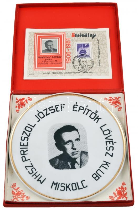 1981. "MHSZ. Prieszol József Építők Lövész Klub Miskolc" jelzett Hollóházi porcelán plakett tokban, benne "Emléklap Prieszol József elvtárs születésének 75. évfordulója alkalmából" (170mm) T:2