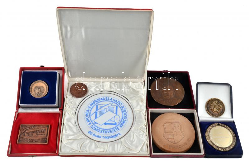 Description: 8db vegyes, oktatáshoz és kultúrához kapcsolódó emlékérem és plakett, legtöbb tokban, közte Pogány Gábor Benő (1962-) 2002. "Magyar Bölcsődék 1852-2002." Br emlékérme tokban tanúsítvánnyal (42,5mm), 2002. "Magyar Gyula Kertészeti Szakközépiskola és Szakmunkásképző - 100 év a szakmunkásképzésben 1902-2002." fém emlékplakett (66mm) T:vegyes