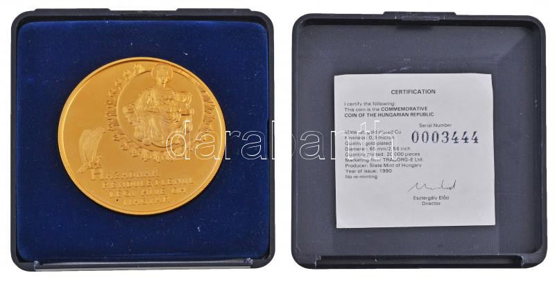 Description: Bognár György (1944-) 1989. "1956-1989 Magyar Köztársaság Emlékérem" Cu aranyozott nagyméretű piefort emlékérem (65mm) T:PP Tanúsítvánnyal sérült dísztokban