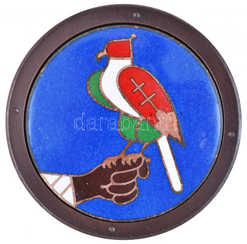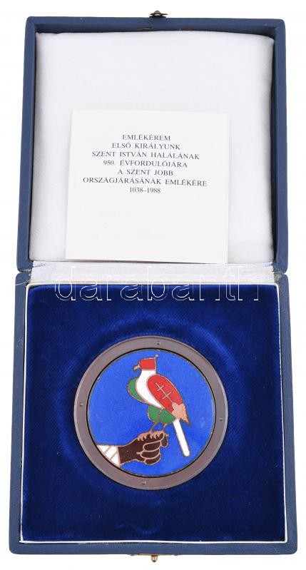 Description: Papp László (1947-) 1988. "Emlékérem első királyunk Szent István halálának 950. évfordulójára a Szent Jobb országjárásának emlékére 1038-1988 / Turul" patinázott és zománcozott vörösréz emlékérem (70mm) T:2