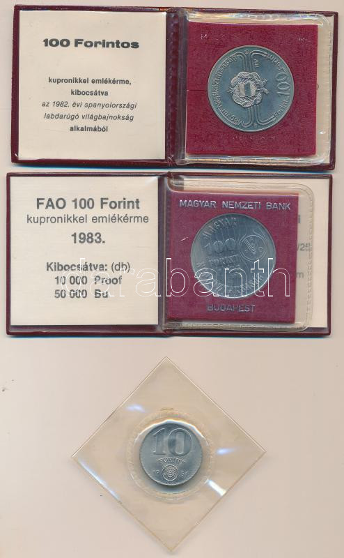 1981. 10Ft "FAO" eredeti vákuumcsomagolásban + 1982. 100Ft Cu-Ni "Labdarúgó VB" tokban tanúsítvánnyal + 1983. 100Ft Cu-Ni "FAO" tokban tanúsítvánnyal T:1,BU