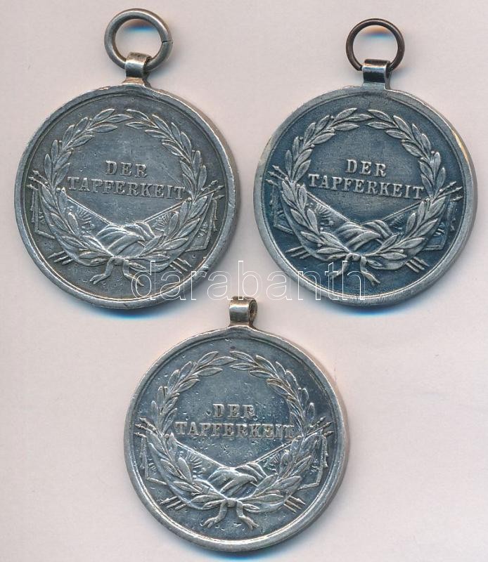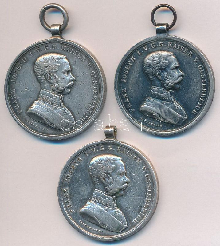 Description: 1914. "Ferenc József II. osztályú Ezüst Vitézségi Érem" (3x) kettő ezüst "A" fémjellel peremen, kitüntetések mellszalag nélkül. Szign.: Tautenhayn T:2,2-
