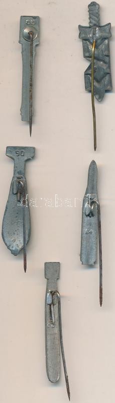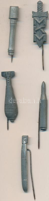 4db klf lövedék alakú fém kitűző (kézigránát, torpedó, aknavető gránát, harckocsi lövedék) + DN "MKM" fém kitűző T:2