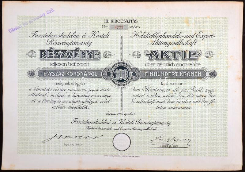 1918. "Faszénkereskedelmi- és Kiviteli Részvénytársaság" részvénye 100K-ról, magyar és német nyelven szelvényekkel, bélyegzéssel T:I- hajtatlan