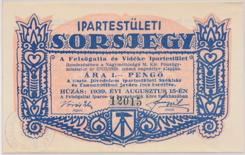 1939. "Ipartestületi Sorsjegy - A Felsőgalla és Vidéke Ipartestület" sorjegye 1P értékben, bélyegzéssel T:I-