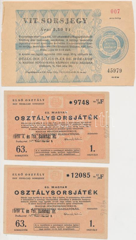 1949. "63. Magyar osztálysorsjáték" 1/8 sorsjegy, 1. osztály (3x) + 1959. "VIT Sorsjegy" 3 1/2Ft T:III,III-