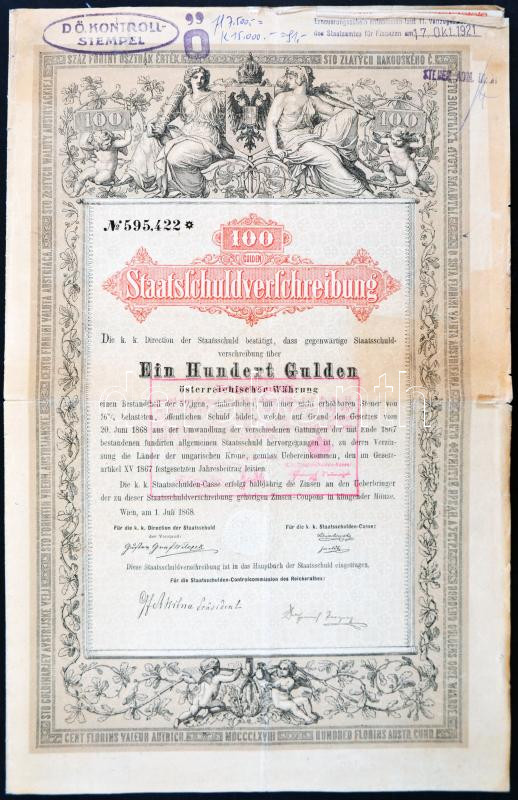 Description: Ausztria / Bécs 1868. "Államadóssági Igazgatás" államadóssági kötvény 100G-ről, szárazpecséttel, szelvényekkel, felülbélyegzésekkel T:III