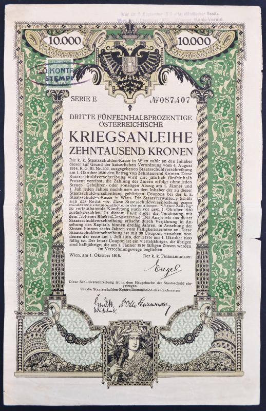 Ausztria/Bécs 1915. "3. Háborús Hadikölcsönkötvény" 10.000K-ról szelvé... https://www.darabanth.com/en/227-Online-auction/227.0/Numismatics/Shares-and-Tickets~600006/AusztriaBecs-1915-3-Haborus-Hadikolcsonkotveny-10000K-rol-szelvenyekkel-belyegzess~II1006661