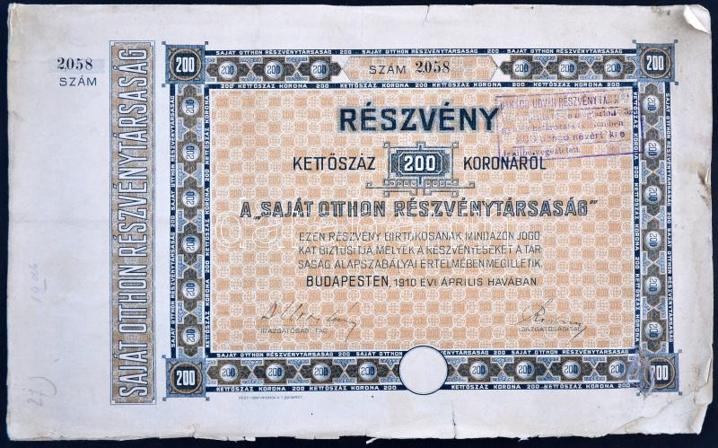 Budapest 1910. "Saját Otthon Részvénytársaság" részvénye 200K-ról, sze...