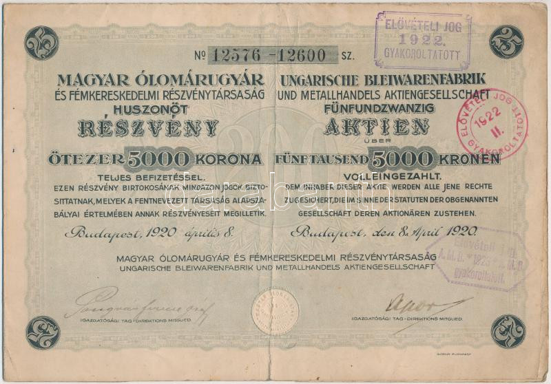 Budapest 1920. "Magyar Ólomárugyár és Fémkereskedelmi Részvénytársaság" 25 részvénye 5000K-ról elővételi jog gyakorlásáról szóló bélyegzéssel T:III