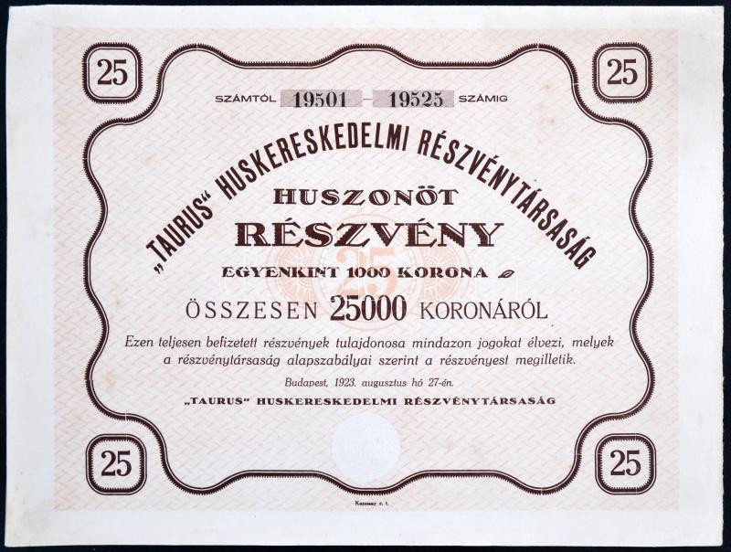 https://www.darabanth.com/en/227-Online-auction/227.0/Numismatics/Shares-and-Tickets~600006/Budapest-1923-Taurus-Huskereskedelmi-Reszvenytarsasag-25-reszvenye-osszesen-25000K-ro~II1004061