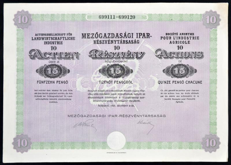 https://www.darabanth.com/en/227-Online-auction/227.0/Numismatics/Shares-and-Tickets~600006/Budapest-1927-Mezogazdasagi-Ipar-Reszvenytarsasag-reszvenye-15P-rol-szelvenyekkel-TI-~II1004173