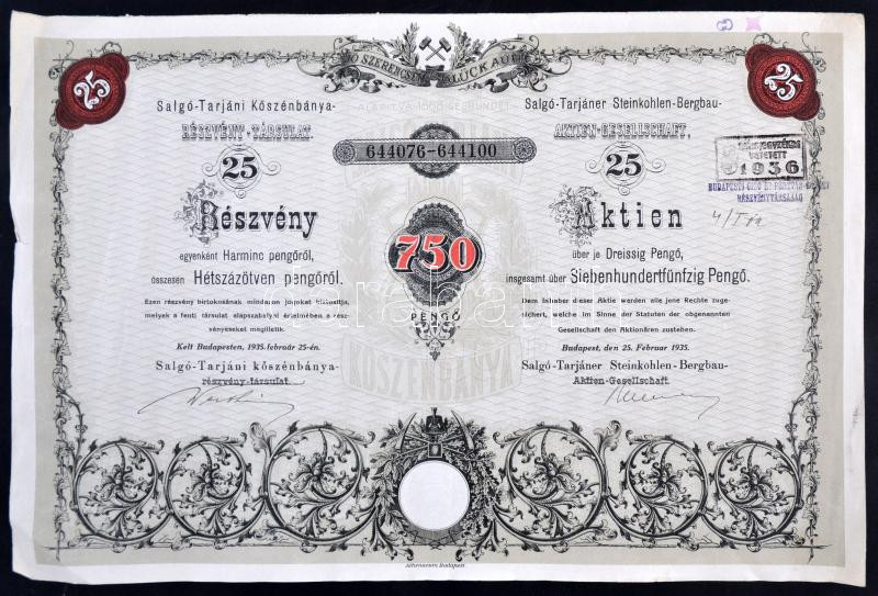 Budapest 1935. "Salgó-Tarjáni Kőszénbánya Részvény-Társulat" részvénye egyenként 30P-ről, összesen 750P-ről, szárazpecséttel, bélyegzéssel, szelvények NÉLKÜL! T:II-,III